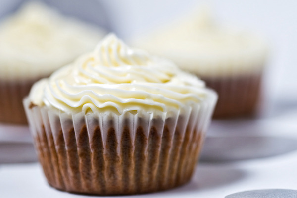 When the cupcakes have cooled completely, melt ¾ cup white chocolate chips and add them to a container of your favorite vanilla frosting. Frost the top of the cupcakes.