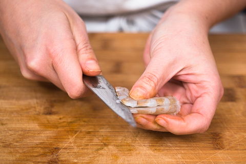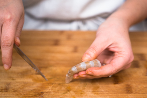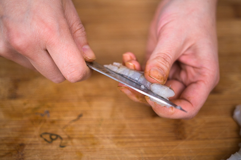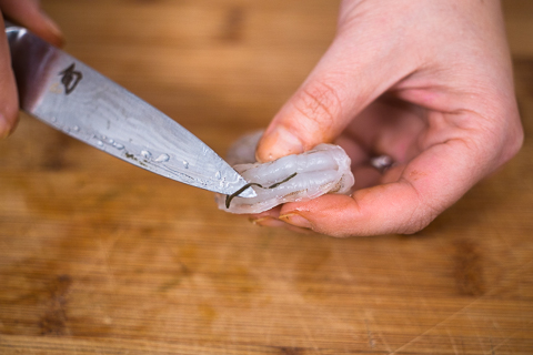 Using the tip of your knife, gently pull the vein out of the shrimp and discard it.