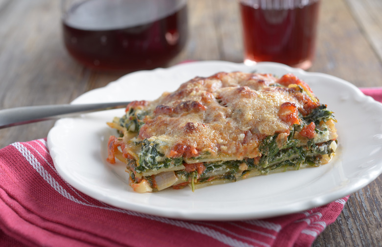 For a vegetarian recipe that is sure to impress your loved one, layer mushrooms, spinach, and good quality tomato sauce with lasagna noodles.