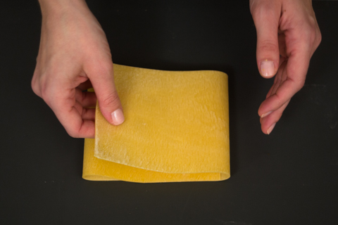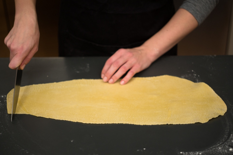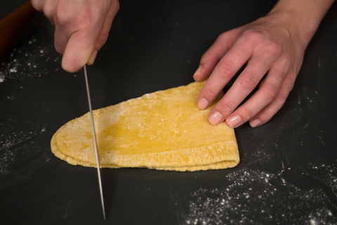 When the dough has a long oval shape, fold it in half width-wise and trim the edges with a sharp knife so that the piece of folded dough more closely resembles a rectangle or square. Trim as little pasta dough as possible.