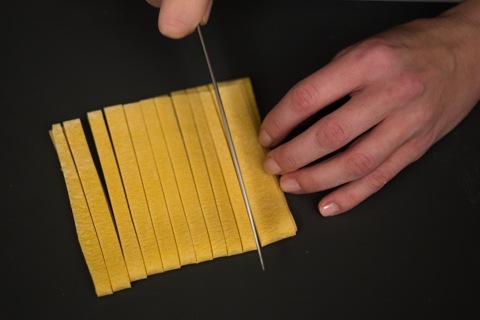 Cut across the dough width-wise at even intervals to create long, thin noodles.