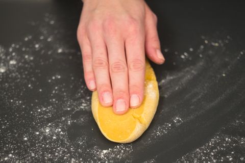Unwrap the pasta dough from the plastic wrap, place it on a lightly floured work surface, and flatten it slightly with your hand.