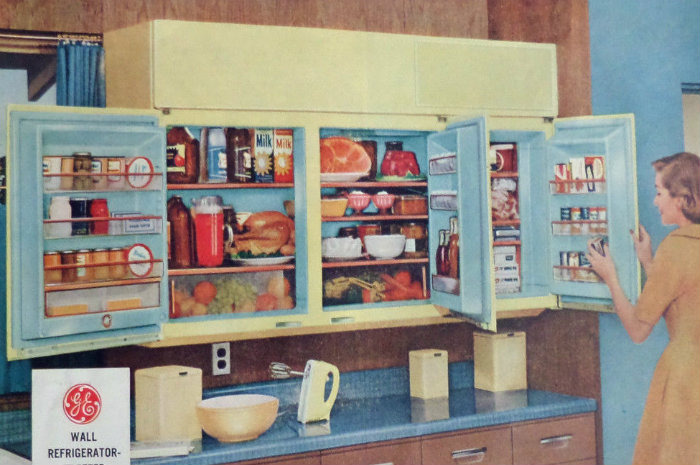 You could store perishables right in your kitchen cabinets with this disguised refrigerator. General Electric came out with this space-saving design in 1955, and boasted of its separate vegetable and fruit drawers, 11 cubic square feet, and whisper-quiet motor.