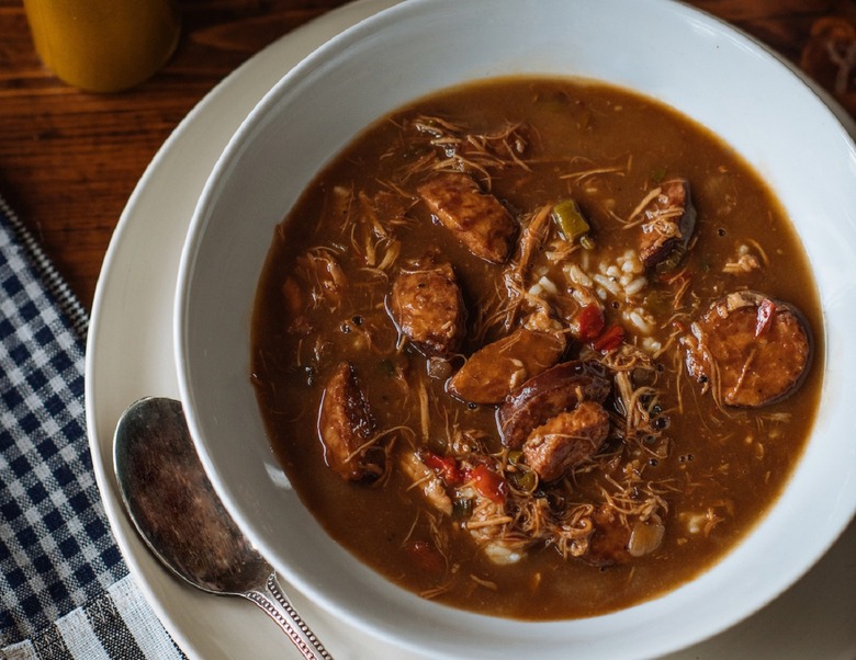 If the dark red-brown broth doesn't make it abundantly clear, this chicken and andouille sausage gumbo is rich and flavorful. The secret? Chicken fat.
