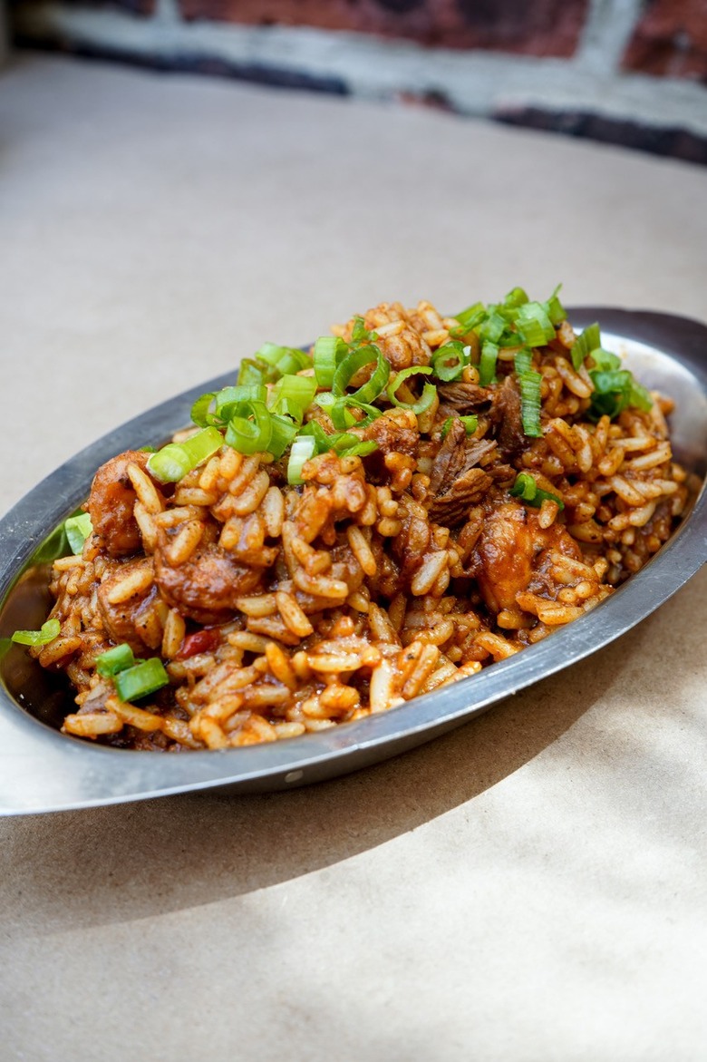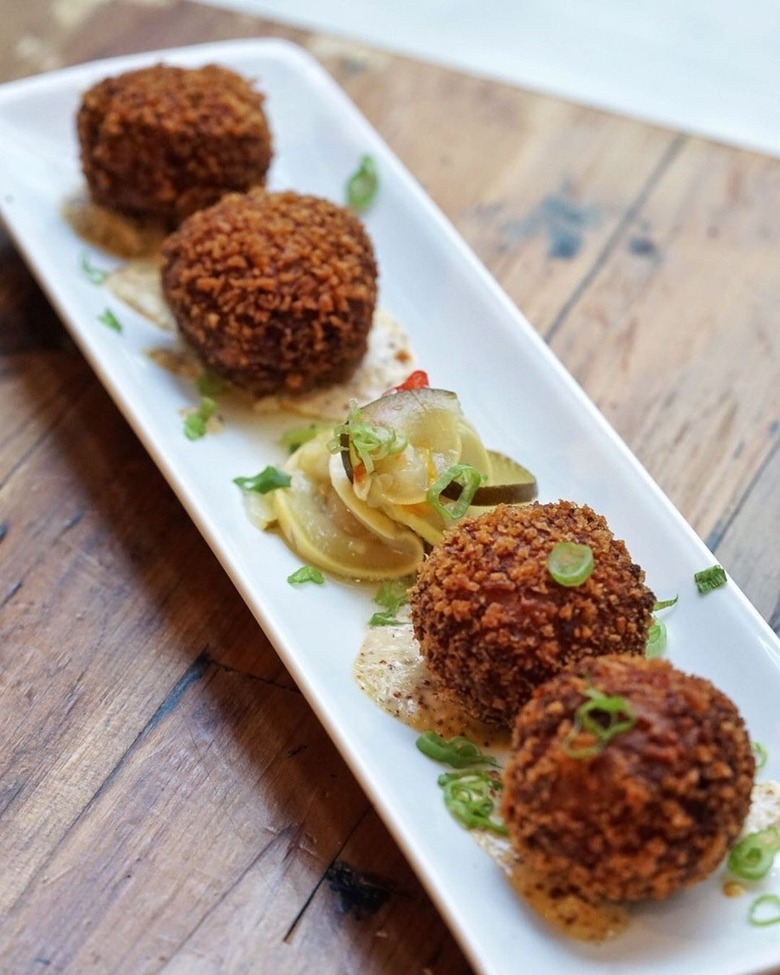 Boudin is the combination of cooked rice, pork, the "Holy Trinity" and plenty of Cajun spice all rolled together. As the name implies, these ingredients are shaped into a ball and dipped into a panko mixture before being deep-fried.