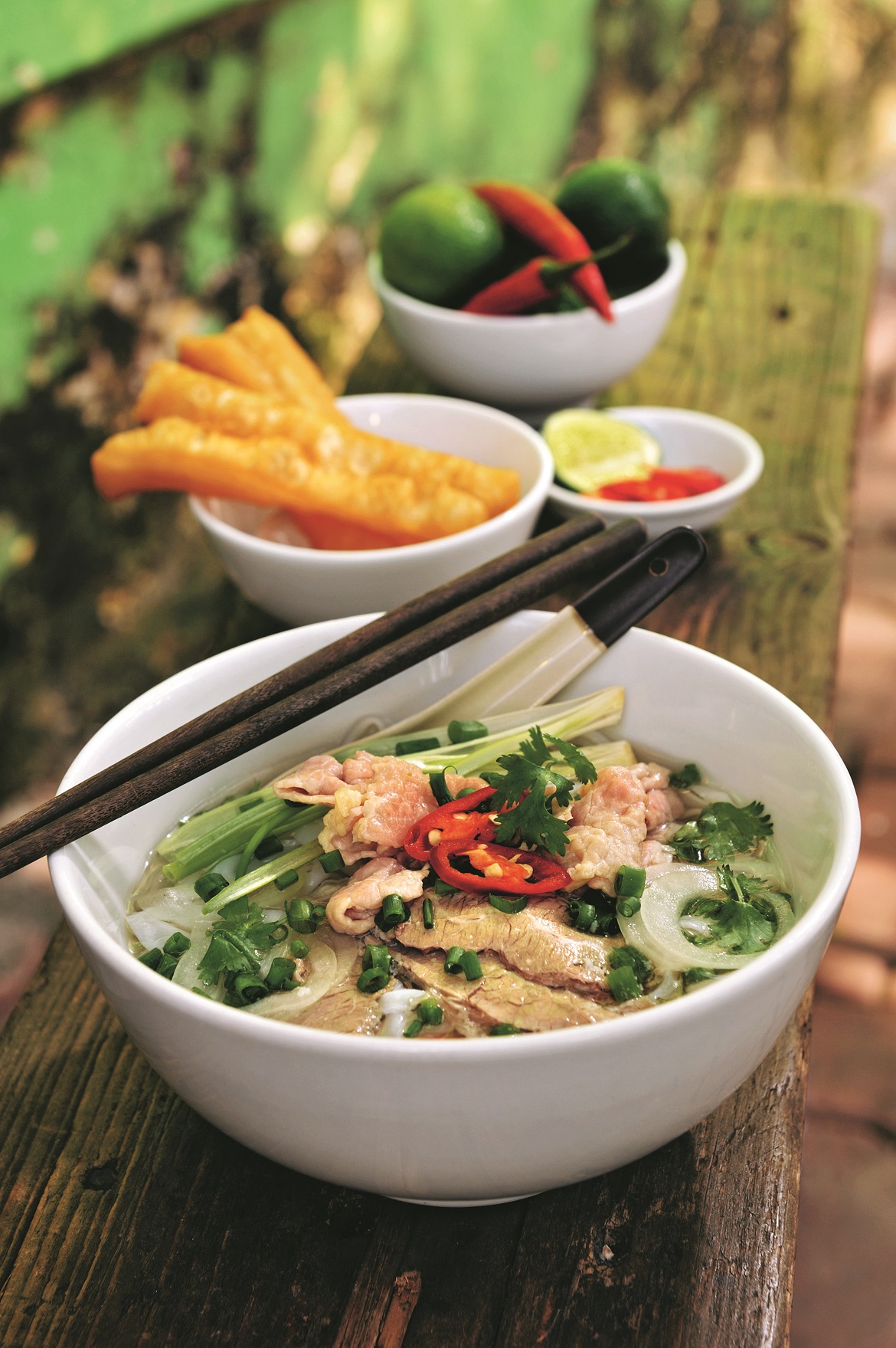 The ultimate comfort food is a big bowl of classic pho bo for breakfast. The perfume of the broth and the herbs and the first taste of the broth really awakens the senses. Pho bo is a perfectly balanced dish. There are carbohydrates in the form of silken rice noodles. Then you have the protein with the beef cooked two ways: one cooked over a long period of time, the other poached à la minute. The noodles and the beef are rounded off by the light, aromatic broth.