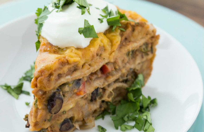 This towering tortilla and bean pie is spiced with garlic, cumin, and chili powder for the perfect meatless Tex-Mex meal. Click here for the recipe.