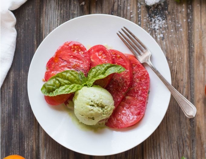 "The creaminess of the ice cream actually mimics the creaminess of fresh mozzarella in a Caprese salad, and the potent basil flavor ties it all together," says Coley Cooks. "The sweetness of the ice cream is set off by a generous sprinkle of sea salt, a drizzle of extra virgin olive oil, and of course the bold, rich acidity of the tomatoes."