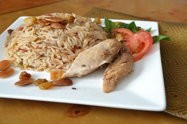 Kabsa (Spiced Chicken and Rice with Almonds and Raisins)