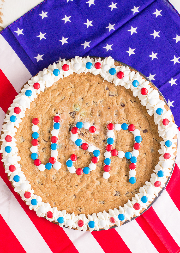 USA! USA! USA! This cookie cake will delight your patriotic sweet tooth. It's also the perfect dish for mini chefs to help with. They can mix the batter and place the chocolate candies into the cake.
