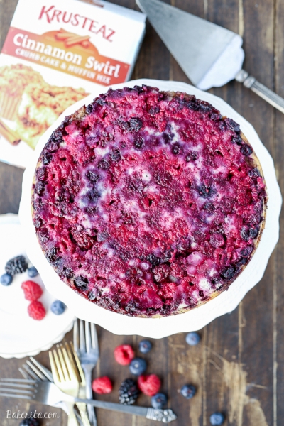 Berries are finally in season so this dessert is just begging to be made! The sweet, tart flavor of berries (blueberry, raspberries, and blackberries) really shine in this upside down cake.