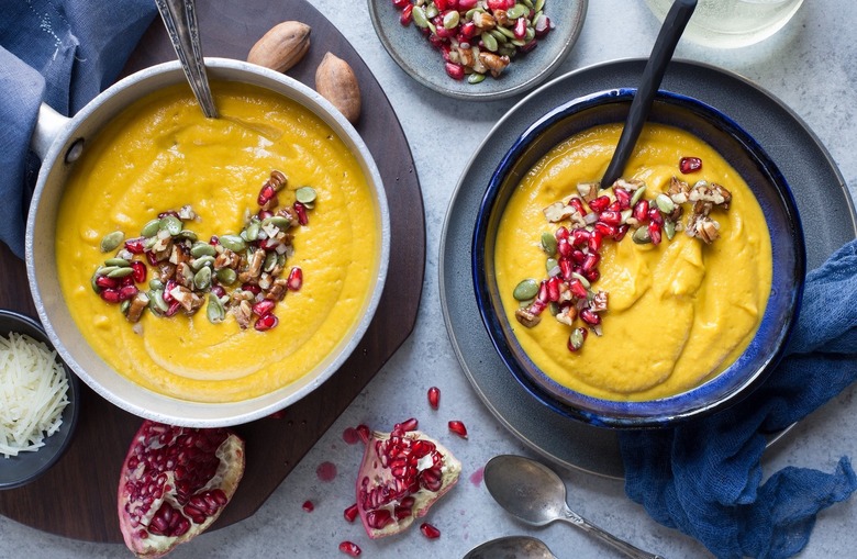 After roasting the pumpkin and sweet potatoes, blend the combination on high with chicken stock, and Parmesan cheese until it's smooth. Top the soup with the homemade pecan pomegranate salsa before serving.