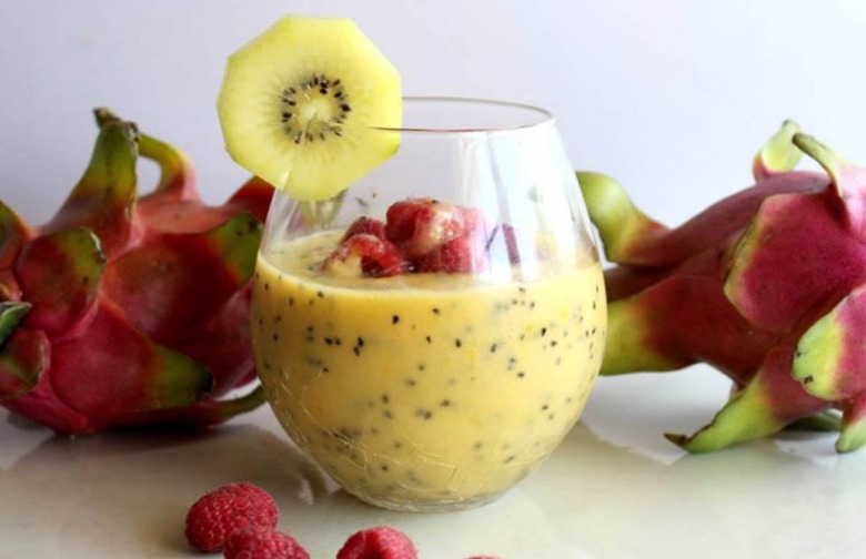 Dragon fruit is an aesthetically striking fruit, but its subtle flavor and creamy flesh makes it the perfect addition to a smoothie. The Hungry Goddess says that when paired with mango, "dragon fruit gives us the perfect vibrational color to match our solar plexus chakra."