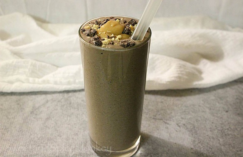 You might be wondering, "How can chocolate peanut butter caramel smoothies be healthy?" Fortunately, Sweet and Spicy Monkey has the answer: By using dark cocoa powder, flax seed, oatmeal, and a homemade salted fruit caramel sauce, this smoothie is not as sinful as it looks.