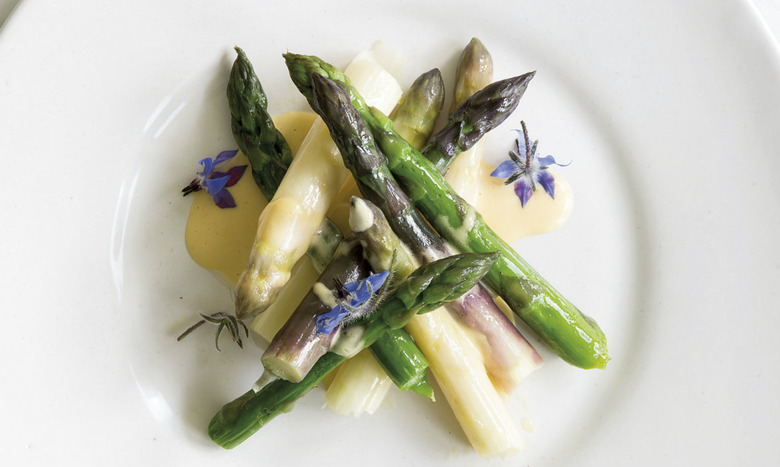 Rich, creamy, and light as air — this is a really nice, simple way to serve asparagus. During its season, I like to eat local asparagus whenever I can. Use a mixture of white and green if possible — the contrasting colors and subtly different flavors are great together. Borage is not so easy to find in stores but if, like me, you grow the herb in your garden, scatter a few flowers over the top just before serving. — Skye Gyngell