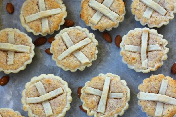 These hand-held tarts use fresh apricot but will also work with apricot jam. They're "divine — a caramely almond marzipan with a hint of apricot, then layered with a fluffier almond sponge cake filling, and all contained within a sweet pastry crust."