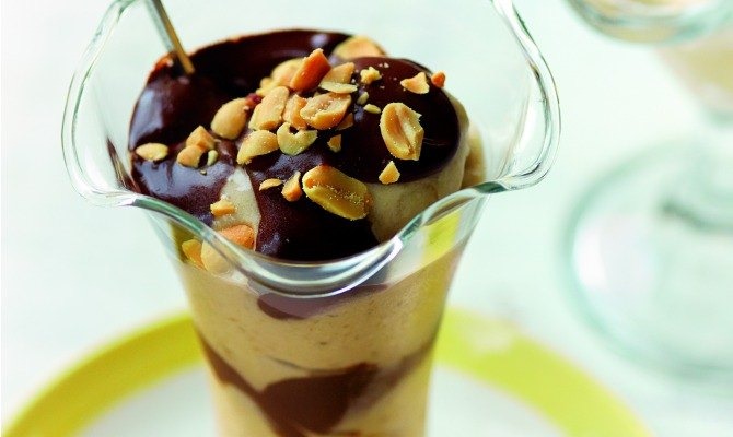 Banana, Peanut Butter, and Chocolate Sauce Sundae. Dairy-filled ice cream has nothing on this (surprisingly healthy) vegan dessert. Mix frozen bananas with maple syrup and peanut butter and top it all off with a hot chocolate sauce.