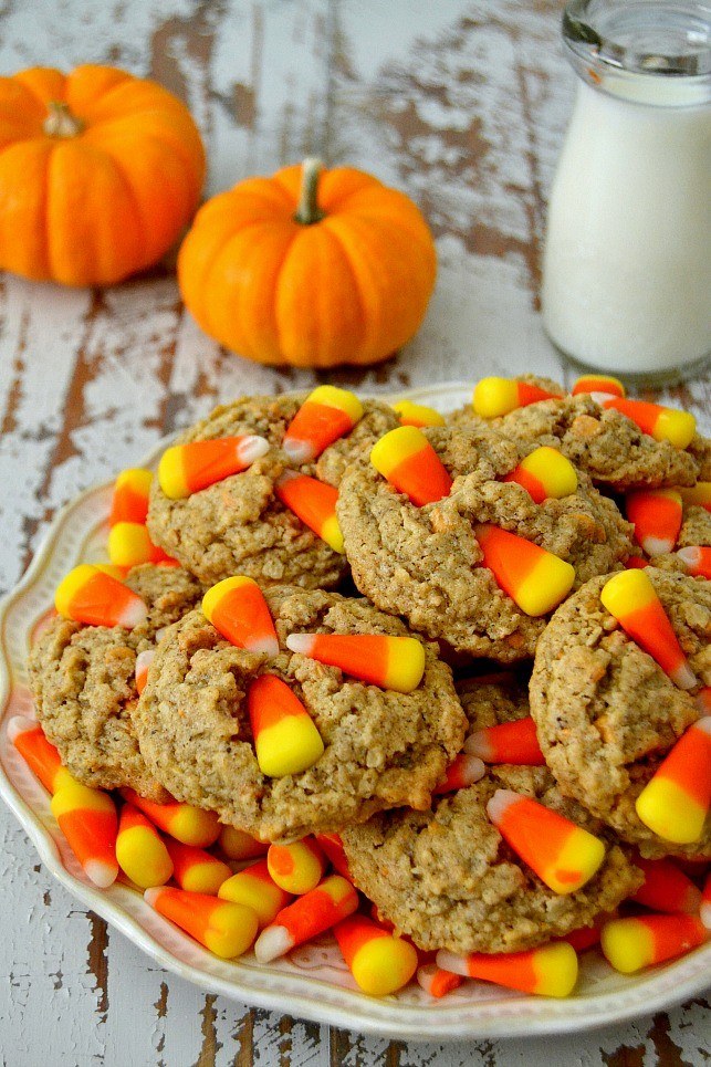 These Peanut Butter Oatmeal Scotchie Cookies come together in minutes and have a fun spin: peanut butter and candy corn! The peanut butter mixed with the rich butterscotch is a match made in heaven.