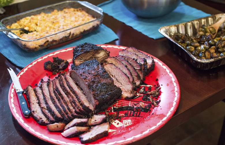 The beauty of brisket is that it can be cooked ahead of time without drying out. Slow-braise this cut of meat until it is "fall apart" tender, and then serve with the reduced braising liquid.