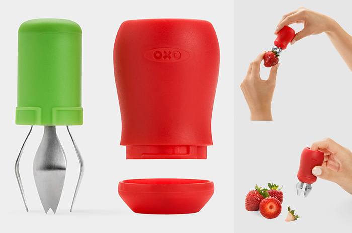 Summer may be over, but that doesn't mean you can't still enjoy strawberries. But who has time to painstaking remove all those stems with a common kitchen knife? Enter the strawberry huller from Smart Design products by OXO. Just push a button, give it a twist, and in mere seconds: no more stem!