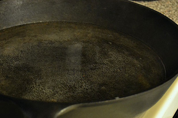 Place pan on burner with a few tablespoons of vinegar and water. Set burner to medium low and warm the water to help remove food debris, then wipe clean with towel.