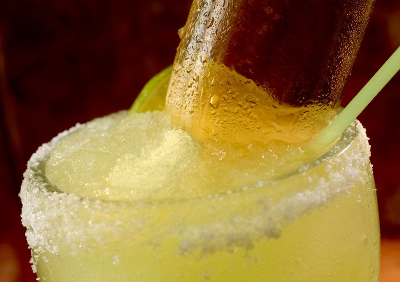 - Open the Coronita bottle and stick it upside down inside the margarita glass.
