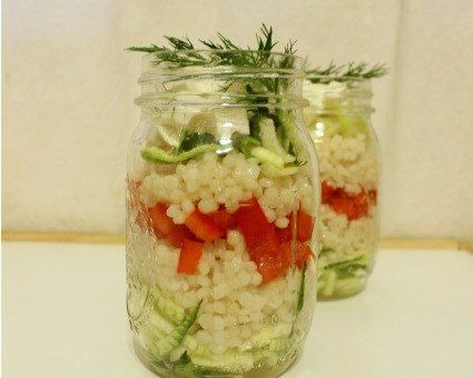 Couscous, small round pieces of pasta made from a mixture of semolina flour and water, makes the perfect base for a cold salad. If you’re looking for something other than a sandwich to pack for lunch, this is a great option. This recipe calls for red bell peppers, zucchini, feta cheese, and a lemon vinaigrette, but you could easily adapt this concept based on the ingredients you have on hand or your personal taste preference. Click here for more pasta salad recipes.