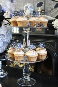 I used lots of plain old glass cake plates (in black, silver, and clear hues, left) to serve cupcakes. Glitter skull stickers transform plain votives (below, left). Traditional dragon-shaped black and silver salt and pepper shakers round out the look, along with timeless mercury candlesticks and cake plates that are typically only pulled out at Christmas time!