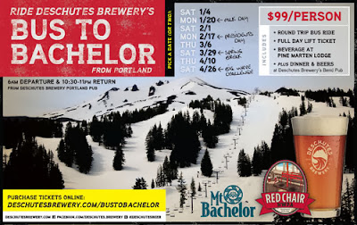 Catch a ride to Mt. Bachelor for skiing or snowboarding with Deschutes Brewery. Trips include bus ride, ski pass to Mt Bachelor, beverage at the lodge, and dinner and beers at the Deschutes Public House in downtown Bend.