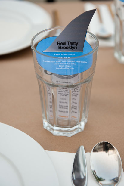 For example, when I hosted a dinner screening the movie JAWS, I created this menu card that brought the food and the movie together in one simple image—a fin coming out of the water—that fit right inside each guest's water glass.
