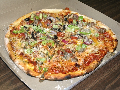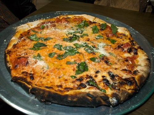 Two 'slice' pies were made, and overcooked. The oil separated (before Dom's signature drizzle), the cheese turned orange, and two-thirds of the crust's rim was charred. The final scattering of grated cheese resembled a masking, not the pleasant accent it can be. Worse, when three patrons lifted slices plate to mouth, the upskirt was black as the coal used in Frank Pepe's ovens. But you can't just go on sight. Right? This was once. Right? What about when pies are made? Is the end of service a valid excuse?