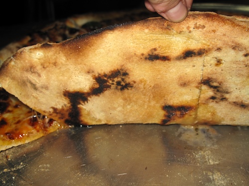 Inconsistent pizza at Di Fara is not news. But consistently burned $5 slices? During a post-$5 slice Di Fara visit on August 1st to sample the eponymous special (sausage, peppers, mushrooms and onions), having been fifteen spots behind the first person, and heeding Adam Kuban's 'Hold Your Ground' advice for once you get inside, I staked out a counter spot. Didn't budge until the pie was ready. It was a prime vantage point to watch every 'slice' pie that left the oven and each slice served. (Upskirt of a single plain cheese pizza slice from a 'slice' pie at Di Fara.)