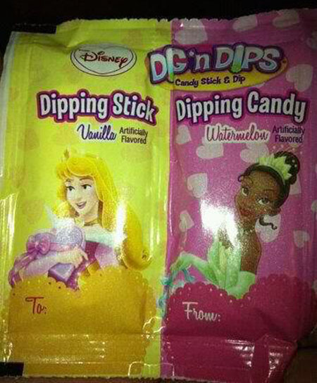 Their Disney Princess Dig 'n Dips Valentine card packets, which have a candy stick and dip à la Fun Dip, showed Sleeping Beauty on the vanilla candy side and Tiana on the watermelon candy side.