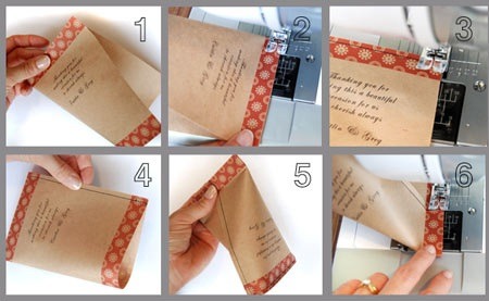 - Now place the top edge of your paper under your sewing machine's "presser foot." Keep the two top corners pinched together and arrange your paper so the corners are pointing towards you. As you lower down the "presser foot" onto your paper you will most likely create a small crease in the paper at the top. Don't worry about this little crease, it won't detract from the beautiful end result.