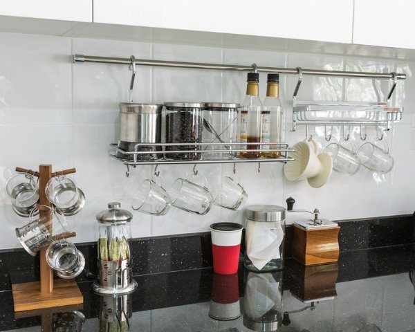 Hooks and racks can add a lot of personality to your kitchen. By adding a rod to your island and hanging your measuring cups and tea towels off of them, you are creating a fun look that may actually help you stay organized in the long run!