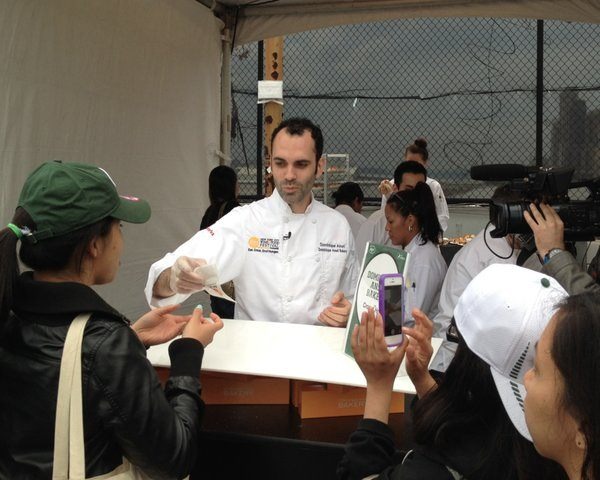 On Saturday, October 20th, the Jets & Chefs Tailgate Party, hosted by Mario Batali and footbakk great Joe Namath, took over the roof of Pier 92 on the far west side of Manhattan, the same location as the Burger Bash the night before. While Batali presented a demo of making sloppy Joes and meatballs with his sons Benno and Leo, and Namath himself even made a couple (very brief) appearances, the longest line at the event was at pastry chef Dominique Ansel's booth, where he personally served cronut holes filled with spiced apple butter to a line that sometimes stretched 60 deep.