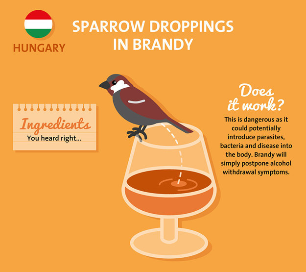 If you're stomach's not already churning from the drink, cures like sparrow droppings in brandy and pickled sheep eyeballs in tomato juice, should do the trick.