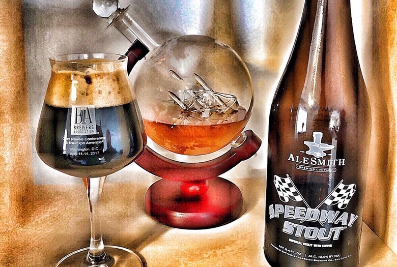 Alesmith's Speedway stout earns its name with its opaque black color. The intensity follows with waves of chocolate and licorice aroma with a smoky roasted coffee flavor. Creamy and lush, this beer ages extremely well, and received a perfect score of 100 from RateBeer and a solid 4.21 on Untappd.