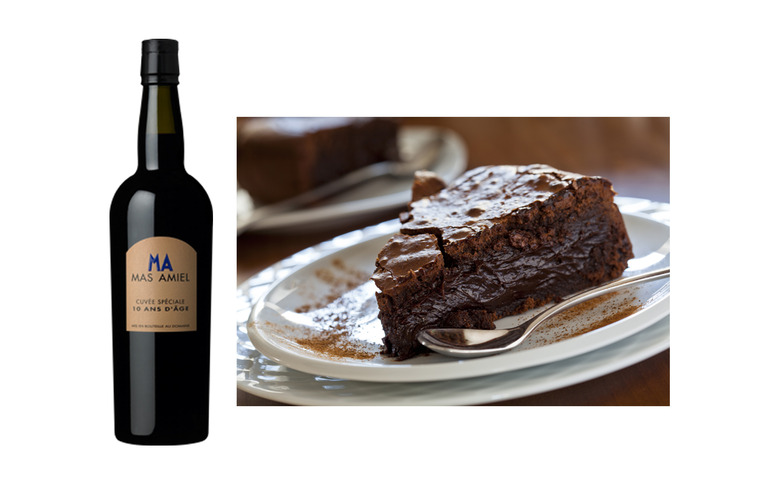 If you are a chocoholic who prefers dark chocolate cake with hints of sugar, choose a red wine that offers a touch of sweetness to balance the underlying bitterness of dark chocolate. A red wine like this Maury, which is not overly sweet, has deep spicy notes that harmonize with the coffee, fruit, nut, and spice notes common in chocolate cake. The cake will taste rich, the wine won't be cloying or too heavy, and together they will be the perfect ending to a meal.