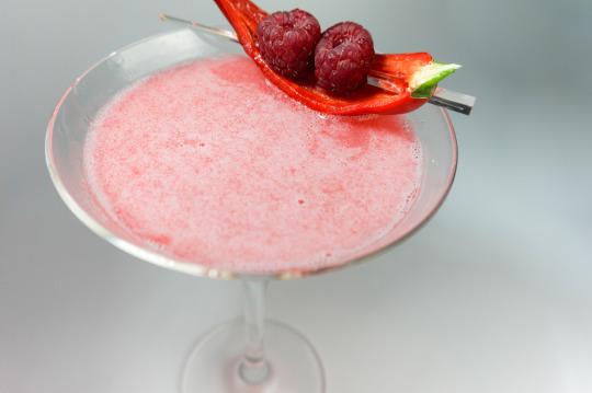 Add ice and shake 20x. Double Strain and serve up. Garnish with skewer of 1 Serrano chile cut lengthwise and two raspberries.