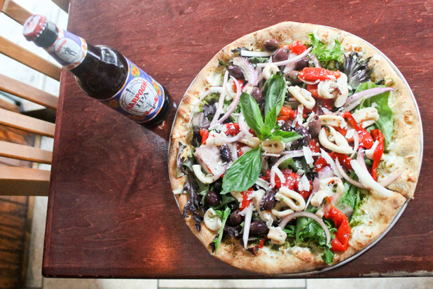 Obviously, there'll be one or two vegetable lovers at your tailgate — so don't leave them out of the fun. Goodfella's has two riffs on a vegetable-centric pizza that are not the norm. There's the pesto calamari pizza (granted, not for the vegetarians at the table), with sautéed calamari, fresh arugula, kalamata olives, roasted peppers, red onion, and fresh mozzarella. For such a salad-gourmet pizza, Kwiatkowski picked the Harpoon IPA; the hoppiness of the beer complements the saltiness from the olives and lets the sweet veggies shine, but still keeps the meal light. Other beers to consider: a pale ale, or a mild hefeweizen.