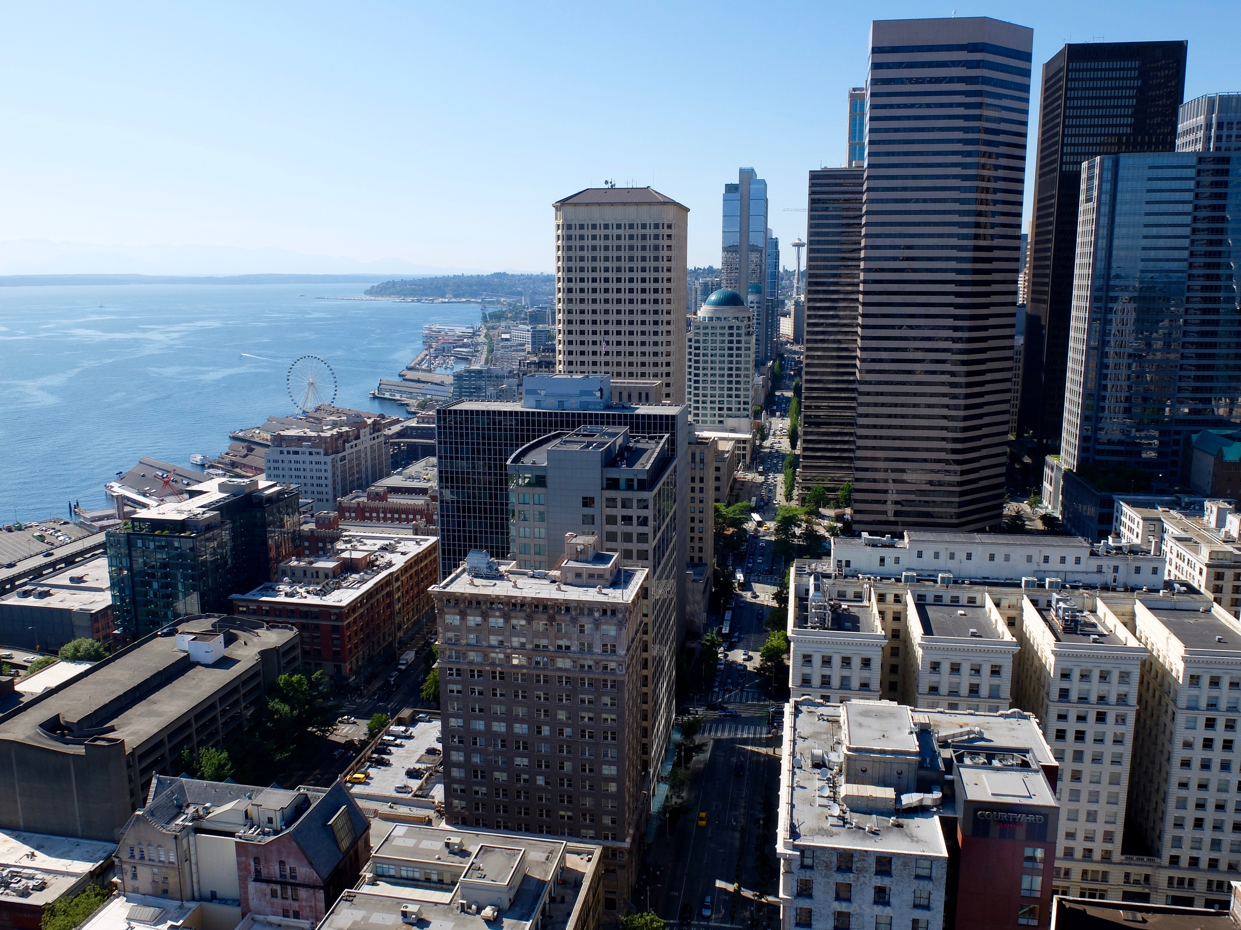 Alongside the bar, the open-air observation deck offers breathtaking 360-degree views. Get a bird's-eye view of Seattle's ever-expanding downtown, ferries traversing Elliot Bay, colorful shipping containers and cranes along the port, and the nearby stadiums. On clear days, get postcard-worthy shots of Mount Rainier and the Olympic Mountains. Views of both I-90, which travels all the way to Boston, and I-5, which reaches along the entire West Coast, provide a sense of the vastness of the States.