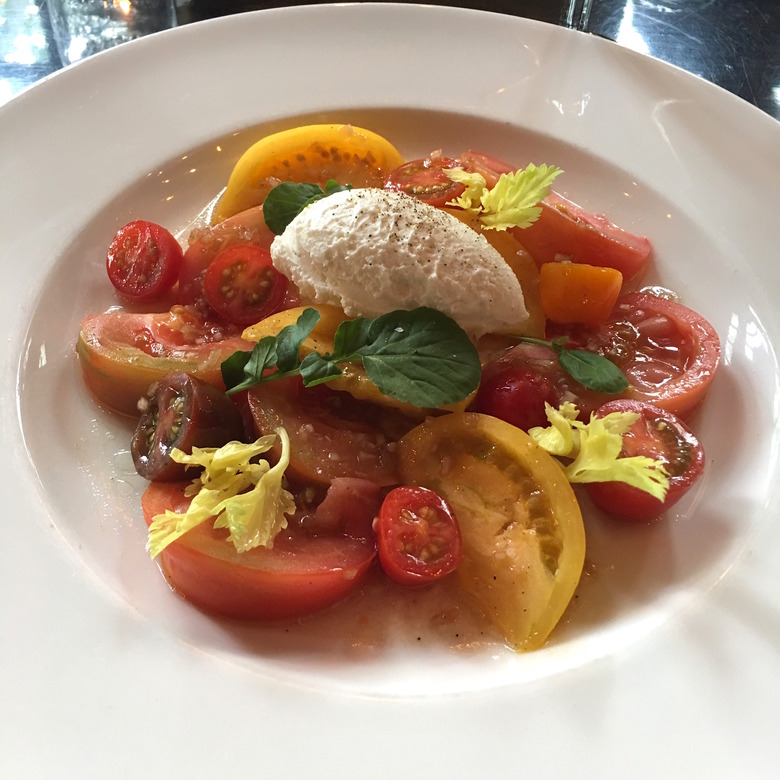Next up, an heirloom tomato salad with goat cheese and local greens served with a sherry-shallot vinaigrette.