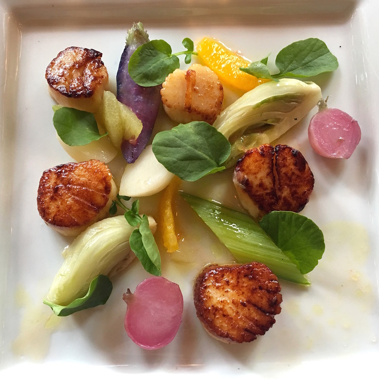 Could it get any better? Why, yes. Perfectly plated sautéed sea scallops with baby turnips, radishes, fennel, and asparagus, served with a citrus vinaigrette.