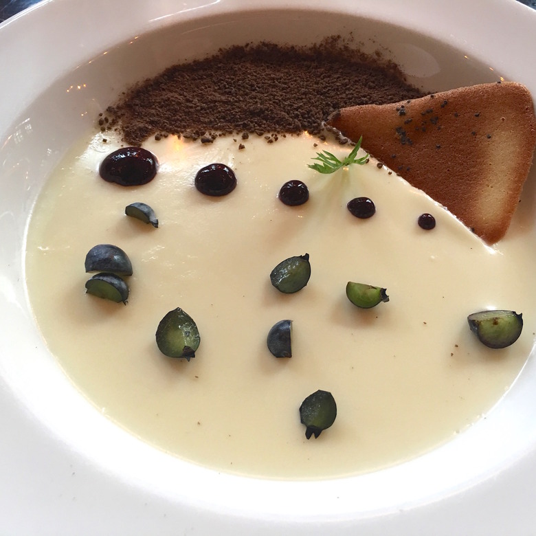 Dessert was a makrut lime panna cotta served with blueberries and a poppy seed tuile. Move over, crème brûlée — this is my new favorite. I look forward to trying to recreate this recipe.
