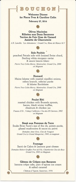 The dinner featured two of Pierre Yves's wines and other Red Burgundies all in magnum. The wines were contributed by George and some of the rest of us at the dinner. Pierre Yves's wines were spectacular. And we also had several other terrific Burgundies, a lovely Champagne, and great old d'Yquem as well. George worked with the chef on the menu. The food was excellent and matched beautifully with the wines. Below is a copy of the menu followed by my notes on the wines.