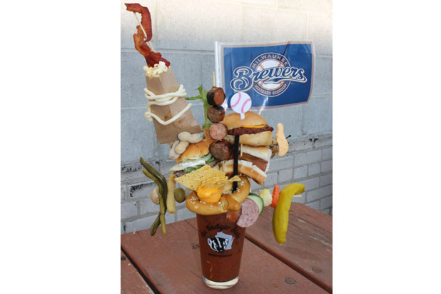 Okay, maybe we're cheating a little with this one because it's just a regular-sized Bloody Mary, but holy guacamole, look at all the food on top! This beast comes stacked high with popcorn, bacon, peanuts, beans, sausage, a pickle, sliders, soft pretzel, cheese curds, and nachos. You'd have to bring a friend along just to help you eat your drink.