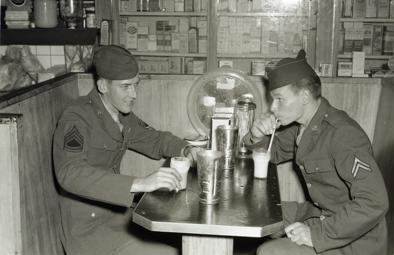 World War II played a big part in two dramatic changes in the soda drink industry that would change the future of the marketplace: Most manufacturing industries were re-tooled to help with war efforts and sugar was under the control of the government until after the war. The limited access to sugar didn't prevent Mountain Dew's founding in 1940 in Knoxville, Tennessee, by the Hartman brothers. Intended as a chaser for moonshine and whiskey, Mountain Dew was sold to the bluegrass set as the ultimate Appalachian drink. The 1940s was also the heyday of soda shops that combined soda fountain service with ice cream and malts that were the hangout for teenagers who listened to music on the juke box. After the war, the trickle of sugar became a deluge when veterans interested in opening soda drink bottling plants were given individual incentives by the government that included a 50-thousand-pound allocation of sugar. In just a few years, there was a surge of plant construction and soda production that paved the way for the boom and prosperity of the 1950s.