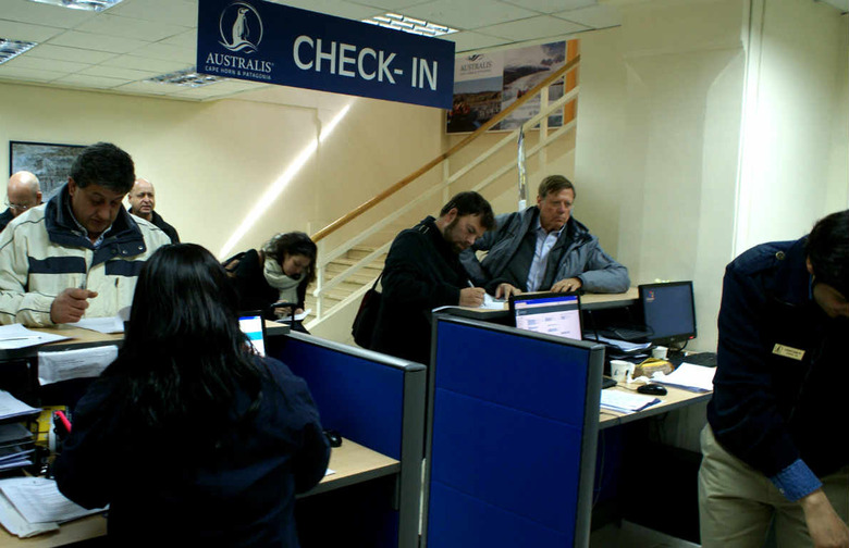 We checked in at the Australis' downtown office, filling out forms, dropping off luggage, and wondering how large our cabins will be. One of our cruise leaders was legendary winemaker and Wines of Chile executive Aurelio Montes, who is in the gray jacket on the right.