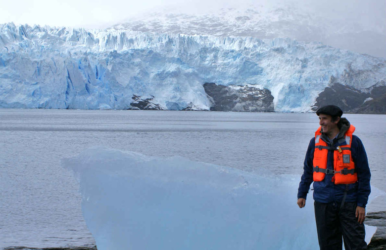 While the Brookes Glacier in the background lets out thunderous groans as its ice constantly shifts under tremendous pressures, Viña Koyle winemaker Cristóbal Undurraga examines a size "petite" iceberg that has broken from the glacier and washed ashore.